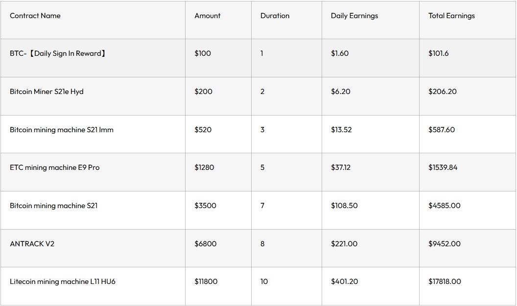 Once a contract is bought, the system automatically sets hash rate and deposits it into the account, with earnings accruing daily. The principal is returned without any penalty when the contract ends..